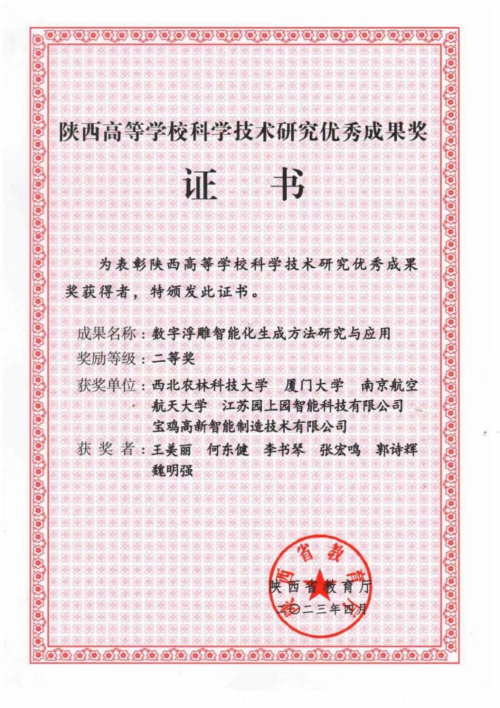 近日,陕西省教育厅印发《关于表彰2023年度陕西高等学校科学技术研究优秀成果奖的通报》,我院王美丽教授主持完成的《数字浮雕智能化生成方法研究与应用》荣获陕西高等学校科学技术研究优秀成果奖二等奖。