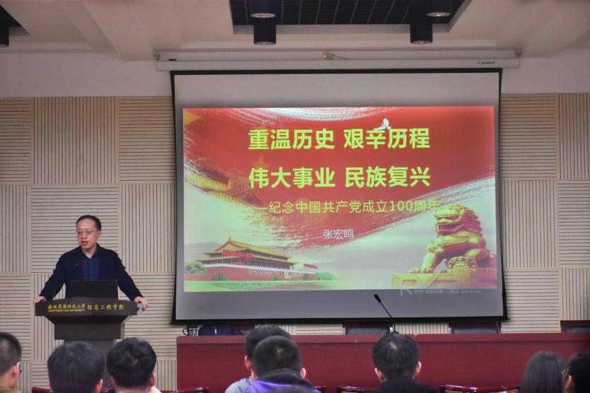 张宏鸣以时间为主线、以事件为标志分享党课,内容翔实、讲述生动。他首先明确学习领悟党史是牢记党的初心和使命的重要途径,要深刻认识三个来之不易,深刻认识红色政权来之不易,深刻认识新中国来之不易,深刻认识中国特色社会主义来之不易。随后他带领同学们回顾了中国的近代史,与同学们共同探讨共产党百年来取得辉煌成就的经验。他结合党史和自身的学习经历,勉励大家要努力学习、知难而上,在学业上要有进取心,要敢于吃苦、敢于坚持、敢于奋斗、敢于挑战,做西农信息的佼佼者。