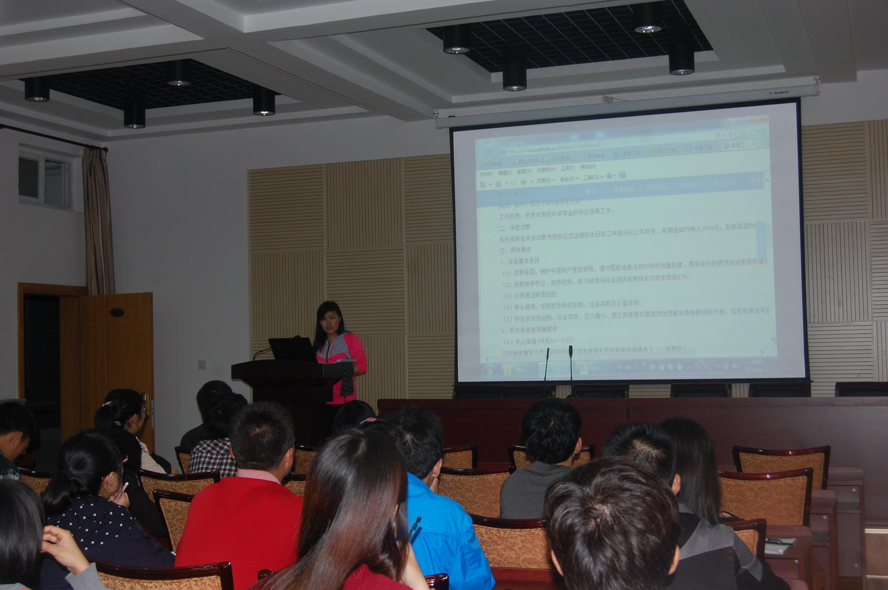 本次会议通报了2013-2014学年度综合测评成绩、专业奖学金、三好学生、优秀学生干部、学生先进班集体评定结果和家庭经济困难学生的认定工作, 安排布置了2014—2015学年度国家奖学金、国家励志奖学金、校长奖学金评定工作、社会各类连续性奖助学金的考核工作、学费减免等相关工作。