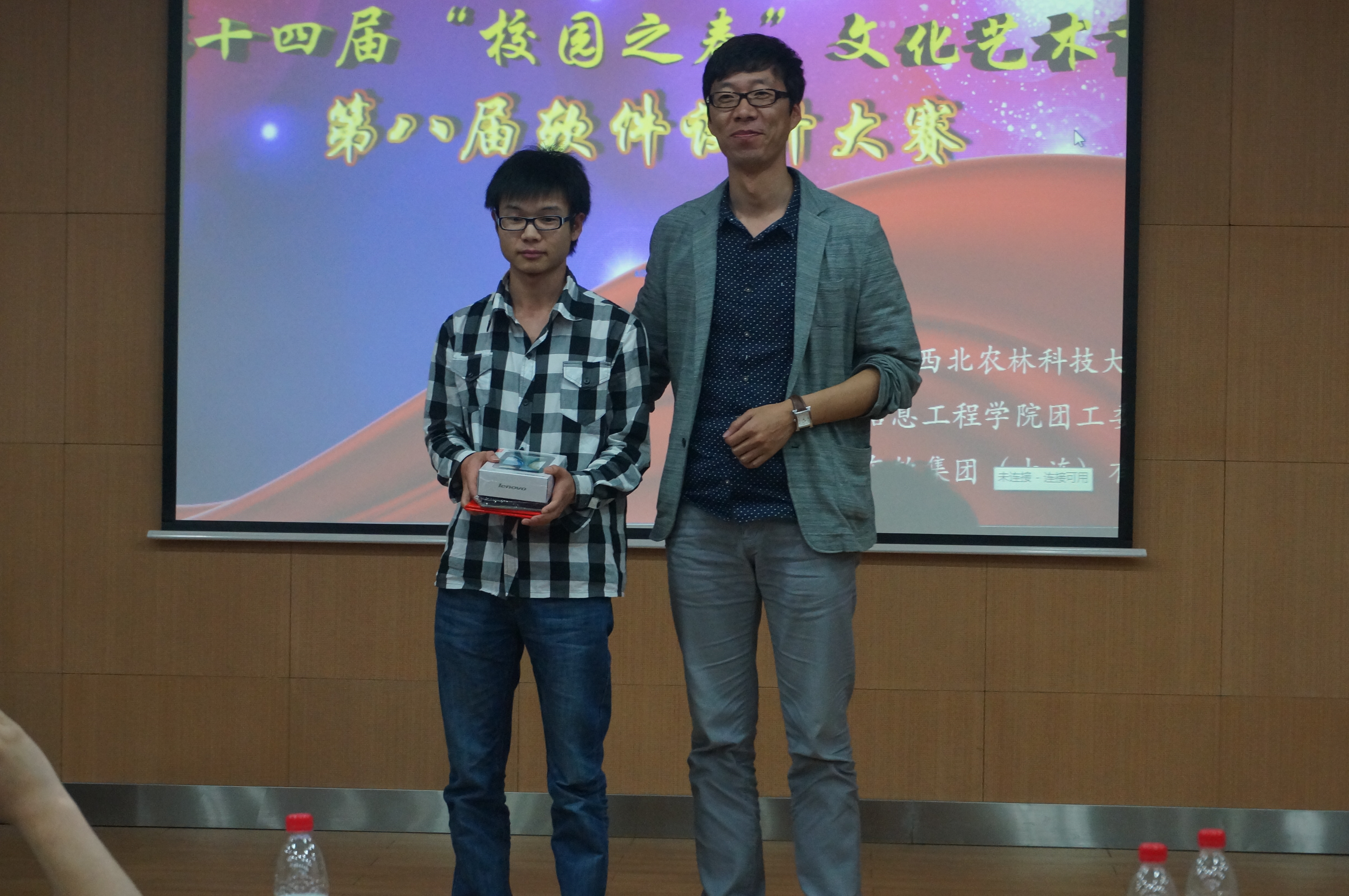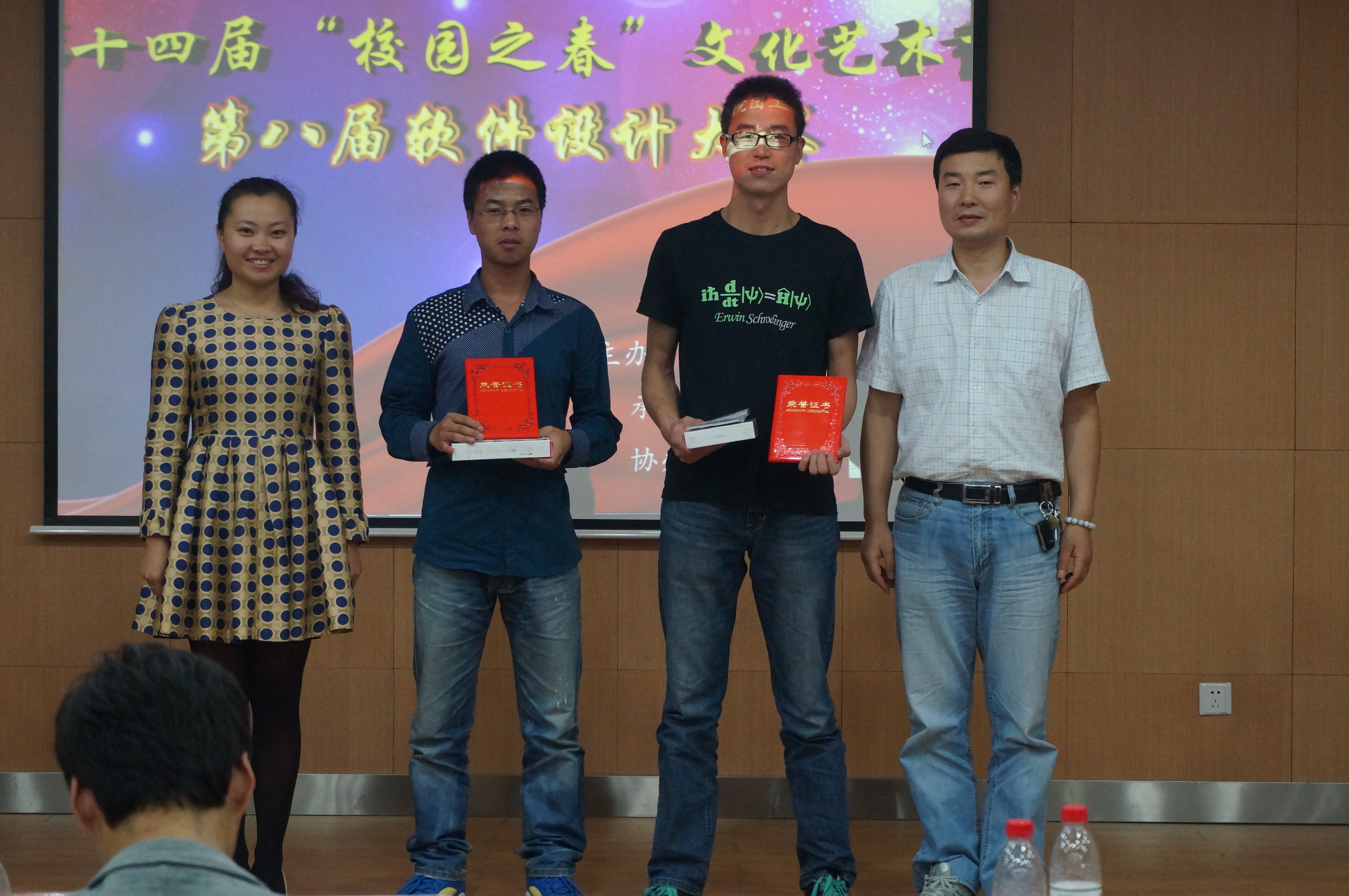随后进入作品展示环节。入围决赛的作品范围跨度较大,技术水平较高。有既娱乐又动脑的圆盘游戏软件、有检查农药化肥施肥情况的农田图像分割软件、有贴近生活的移动办公软件、有便利的速查词典软件等等。参赛选手联系生活实际,发挥特长,用各种语言编写软件,小巧精致,实用性强。大赛中选手们详细介绍了各自的作品,无论是在人机交互上,还是功能性能上大都无可挑剔。参赛队伍的团队合作精神也在作品中充分展现,分工不同的团队成员分别负责回答评委提问中的某一方面。评委老师针对制作技术、前台平面设计、后台操作等方面给予了精彩点评,赢得了现场同学们的阵阵掌声。大赛共评出一等奖一名,二等奖二名,三等奖三名和优秀奖四名,来自信息学院的徐维海同学和耿涛同学以其作品《绘制函数图像软件》获得一等奖,其才华和能力获得了评委的一致称赞。