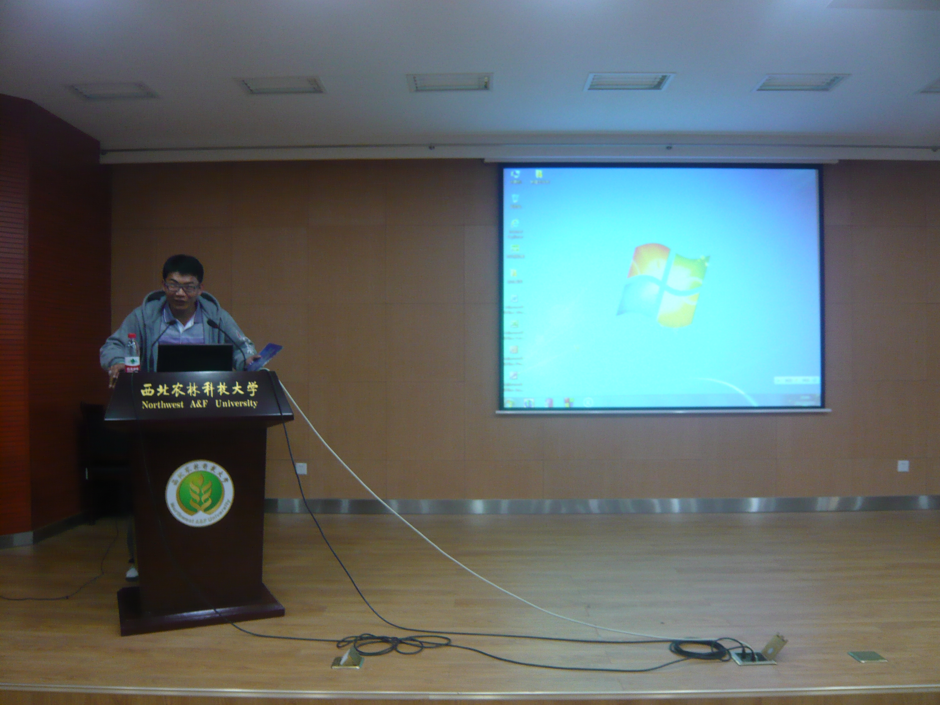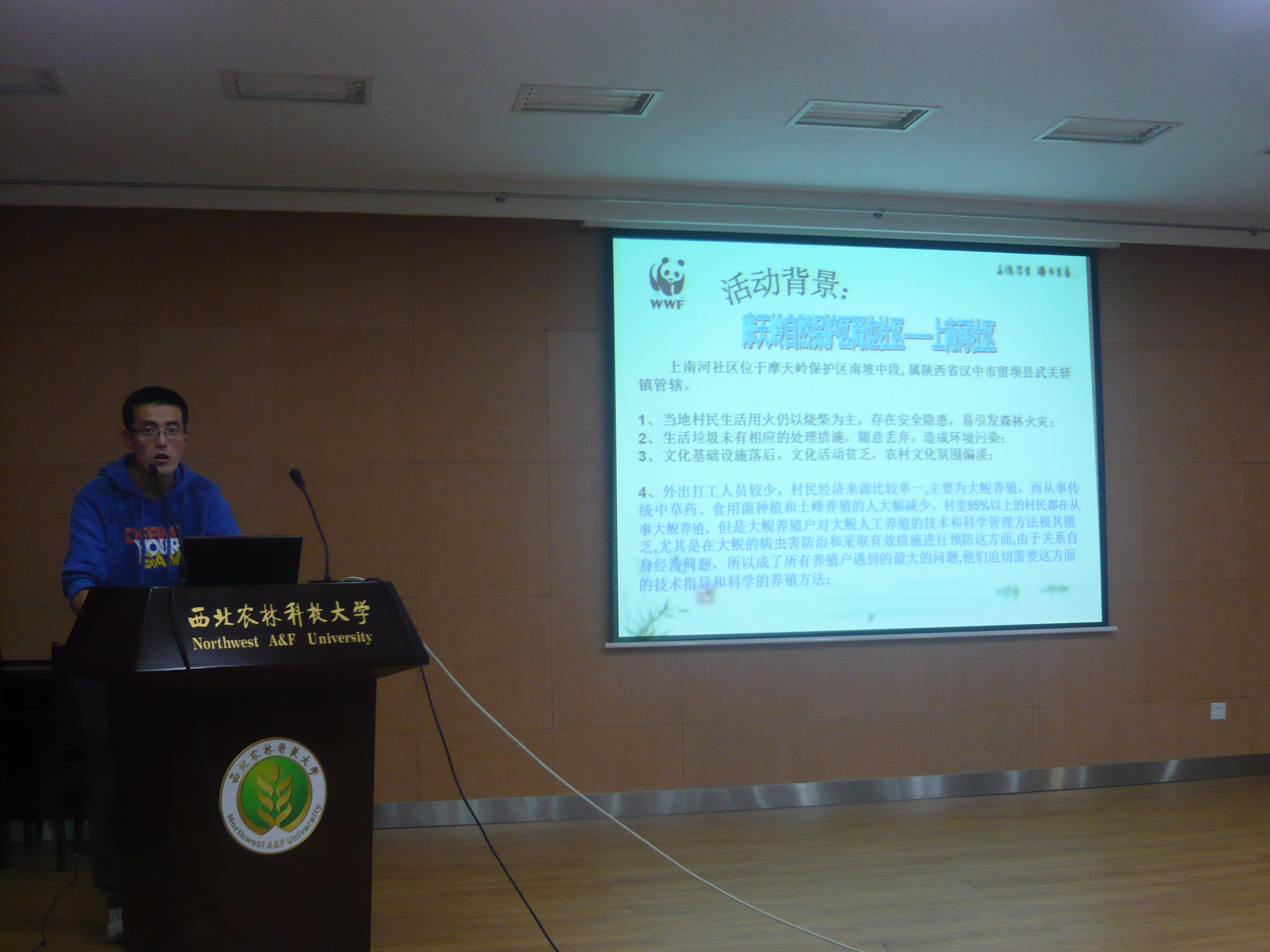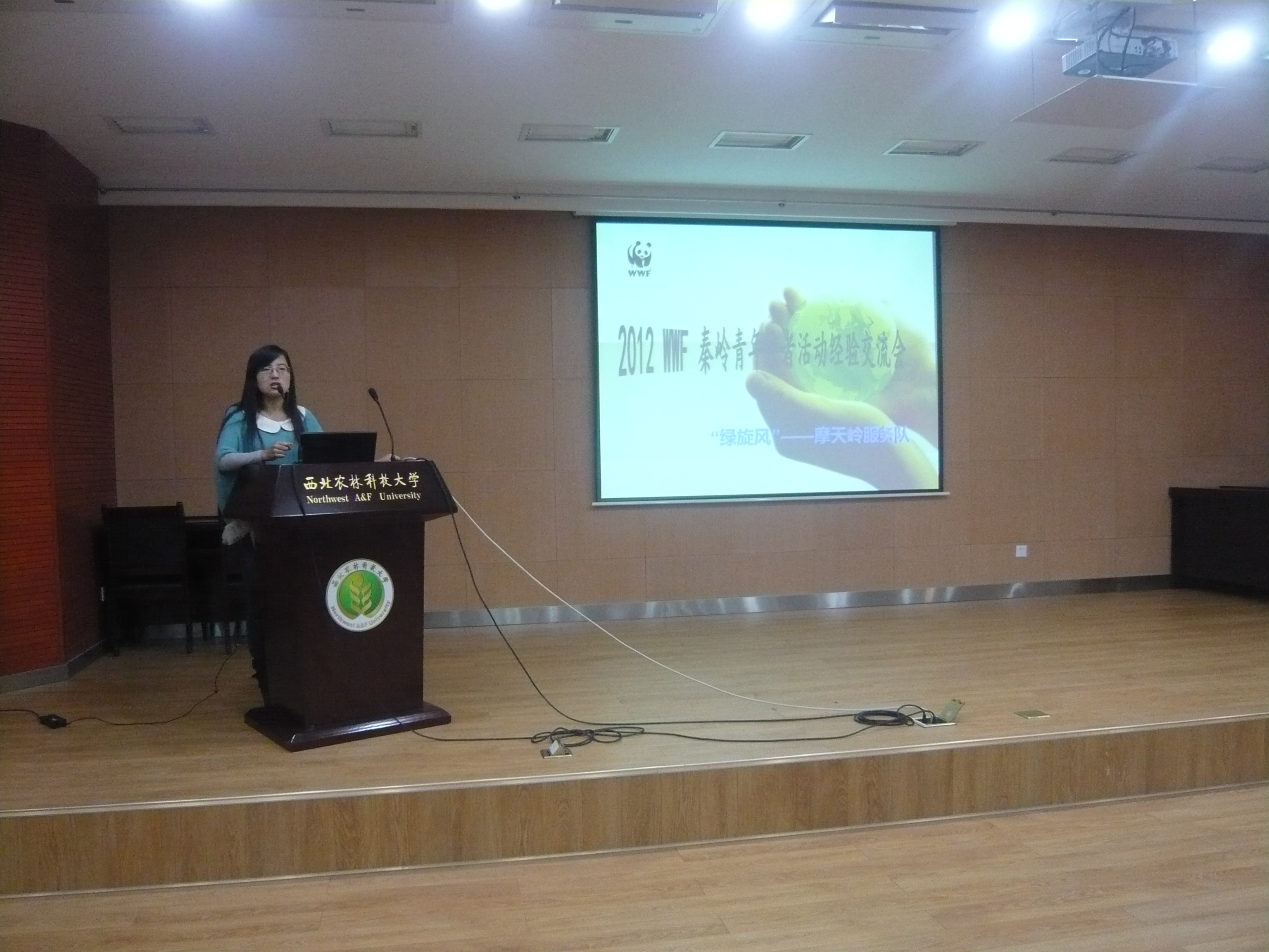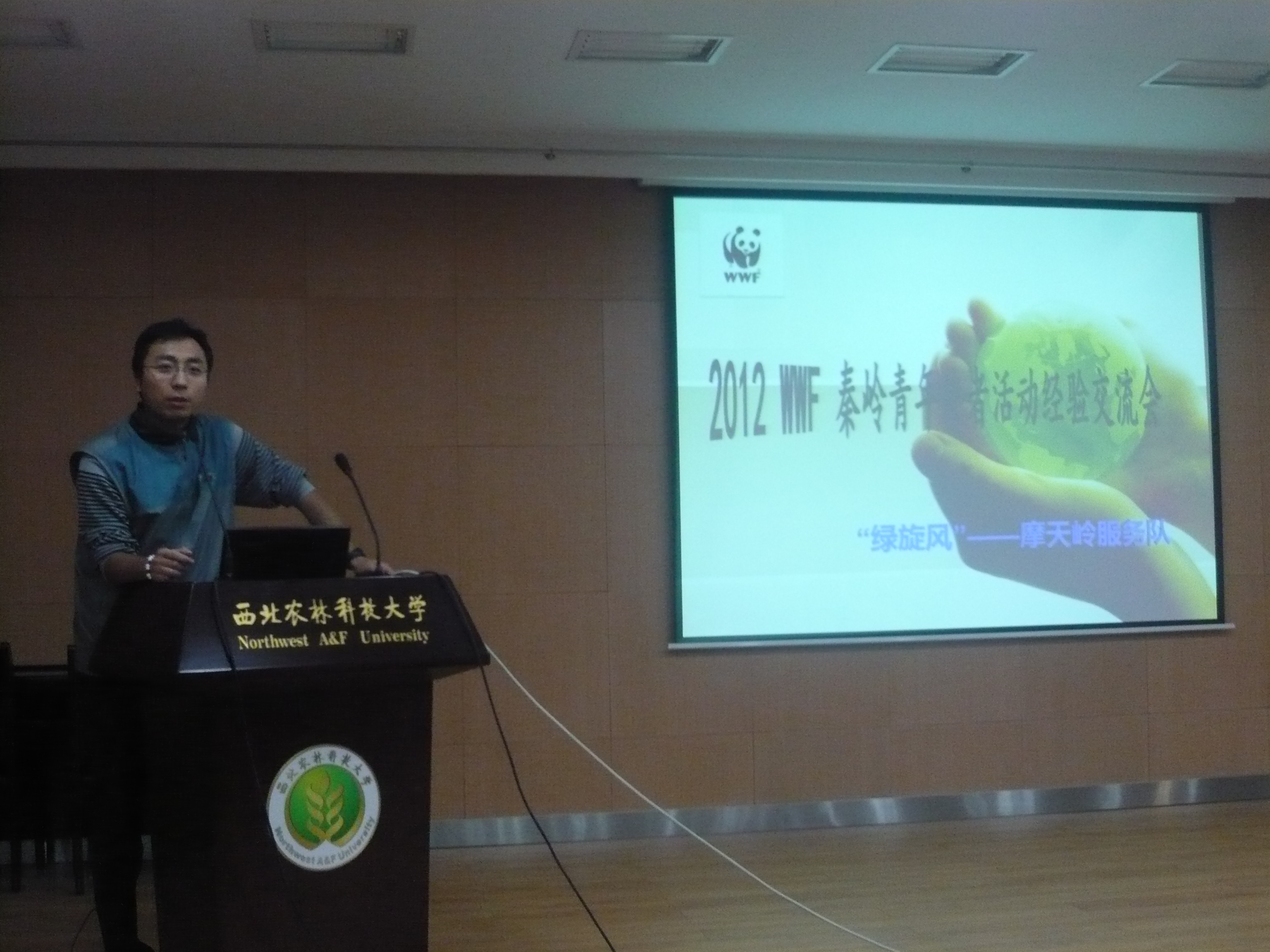 2012 WWF秦岭青年使者活动——“绿旋风”——摩天岭服务队。服务队一行七人假期深入秦岭“摩天岭”保护区,全面调查大鲵养殖问题。本次活动的队员代表曲正祥详细地介绍了WWF组织,以及在秦岭山区的实地考察、试验过程、为当地养殖户提供正确的大鲵病害分析与治疗办法,并将回到学校后的思考与总结与同学们分享。