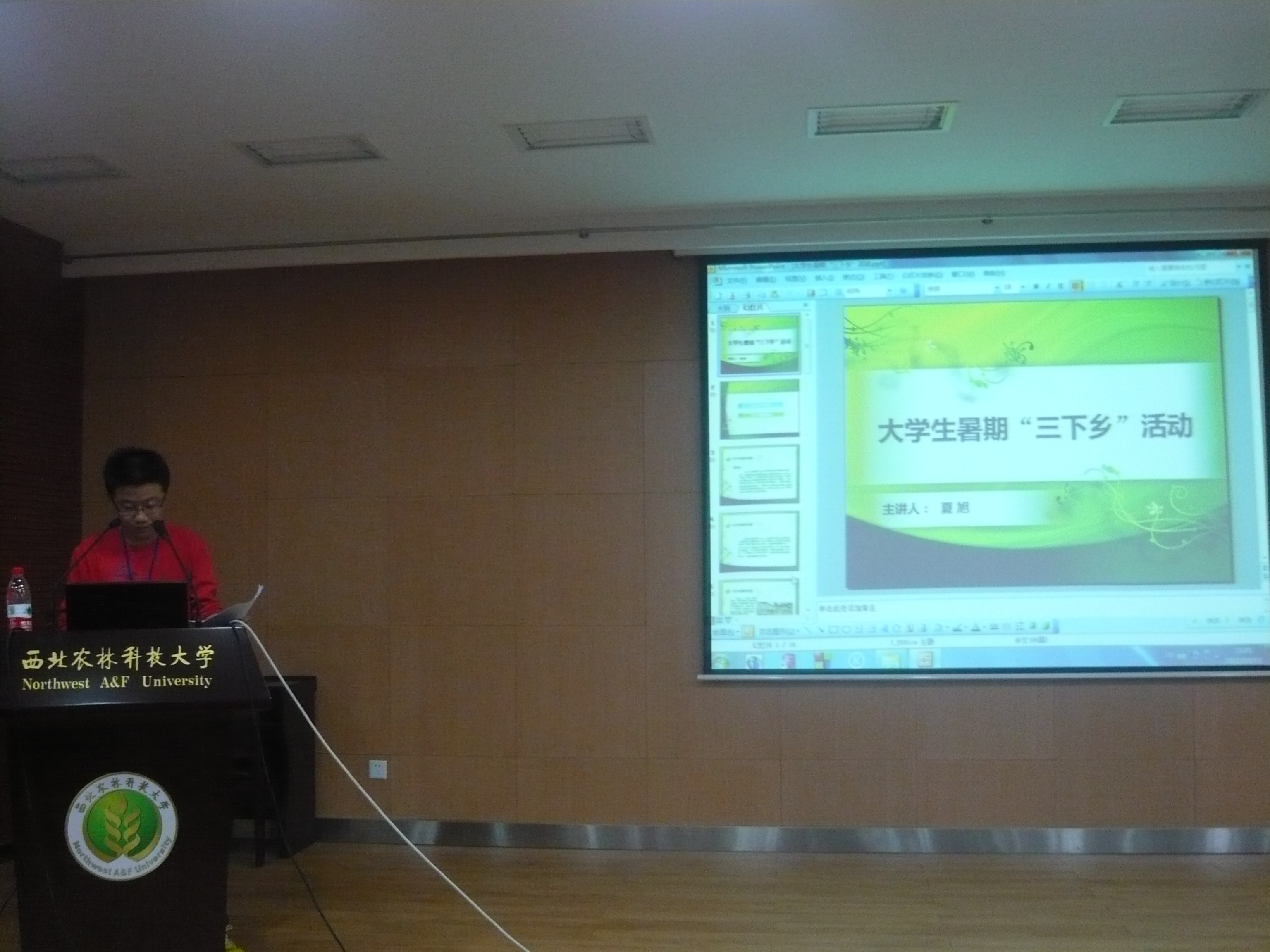 大会开始,首先由桂老师和倪老师先后向同学们介绍了我校的几个特色社会实践活动,其中包括2012WWF秦岭青年使者活动、赴延安支农支教服务队、多媒体培训服务队、暑期“三下乡”活动、计算机义务服务队活动等,老师们在讲话中指出参与社会实践活动有助于开阔学生视野,提高学生综合能力,并鼓励在场2012级新生积极参加大学生社会实践活动与青年志愿者活动,在真正社会实践中收获知识,增长才干。