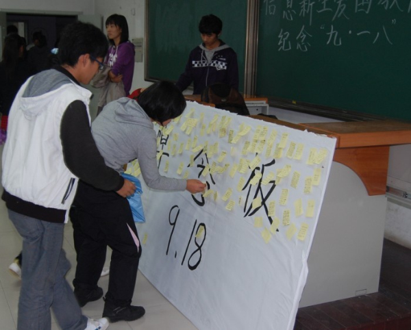在一同观看爱国影片后,同学们通过在纸片上签名、抒写感想,并贴成一面“哀悼板”的形式,提醒自己“勿忘国耻 刻苦学习 报效祖国 振兴中华”的使命。这次纪念国耻日爱国教育起到了应有的效果,大一学生感触颇深,在心底励志奋发图强。我院以后会通过“哀悼墙”等新颖的方式加强对学生的爱国教育,让每个学生都铭记历史,奋发进取。 学生观看爱国教育片 学生在悼念板上书写爱国情怀
